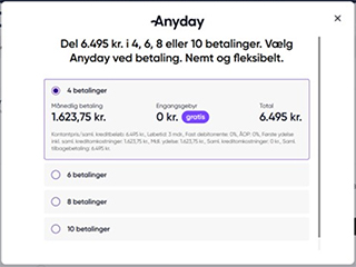 - Krav: For at bruge Anyday skal du være fyldt 18 år og have et gyldigt betalingskort. Der foretages et hurtigt kredittjek ved checkout.